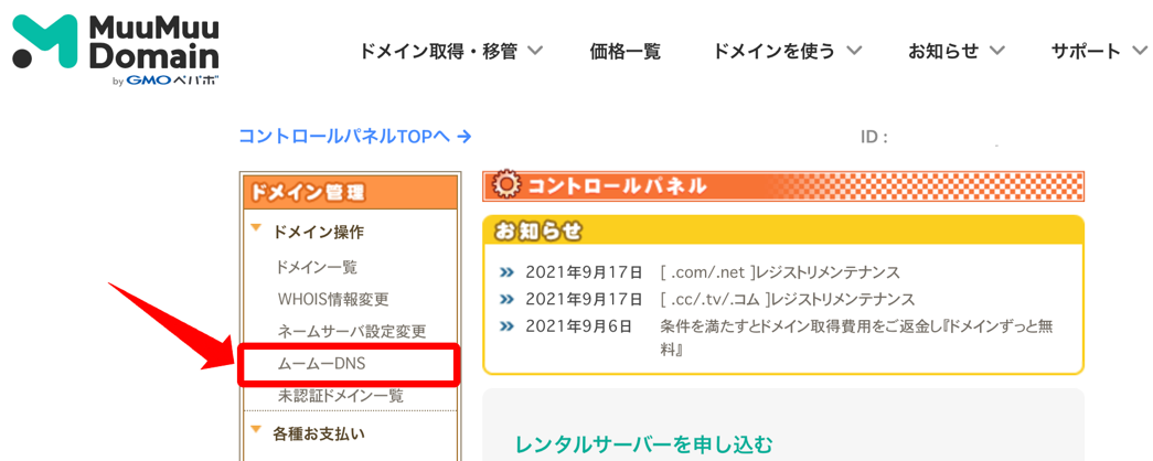 ① ムームードメインのサービスページにログインし、「ドメイン管理」メニュー内の「ムームーDNS」をクリックします。