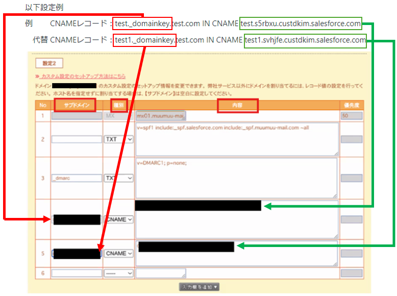 - 繰り返しになりますが、上記はムームードメインでの設定例です。ご利用のドメイン管理サービスによって画面構成や設定項目名が異なります。ご不明な点は、必ずご利用のドメイン管理サービスへお問い合わせください。