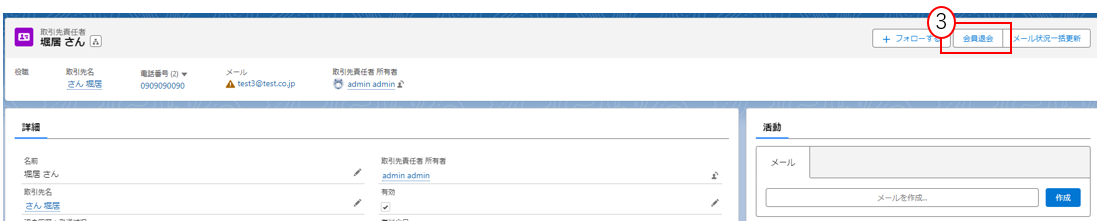 ①「取引先責任者」メニューから、対象の顧客をクリックします。