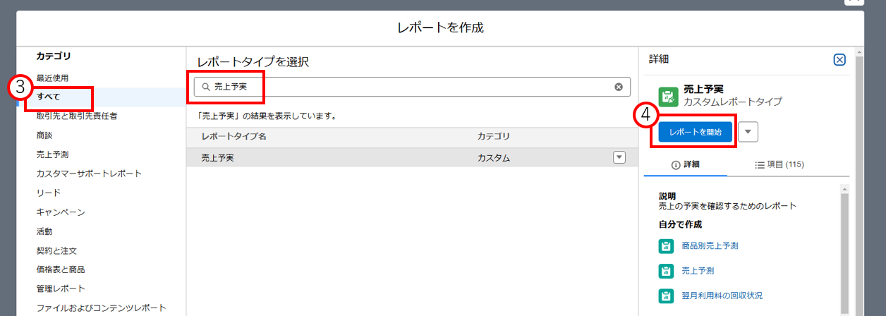 ③:カテゴリ欄の[すべて]を押下し検索タブ[売上予実]と検索。
