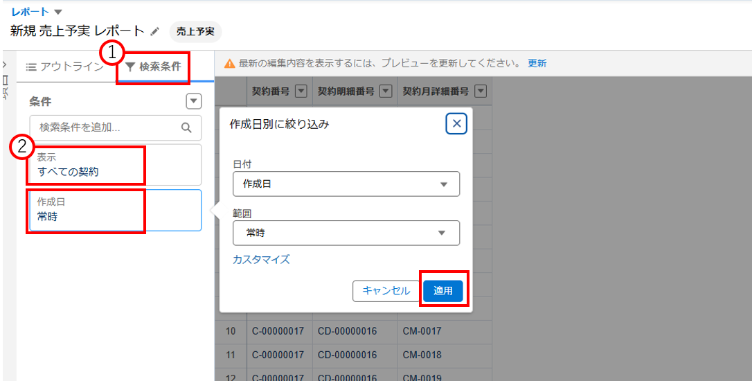 ②:[表示]を[すべての契約]に変更、[作成日]を[常時]に変更。