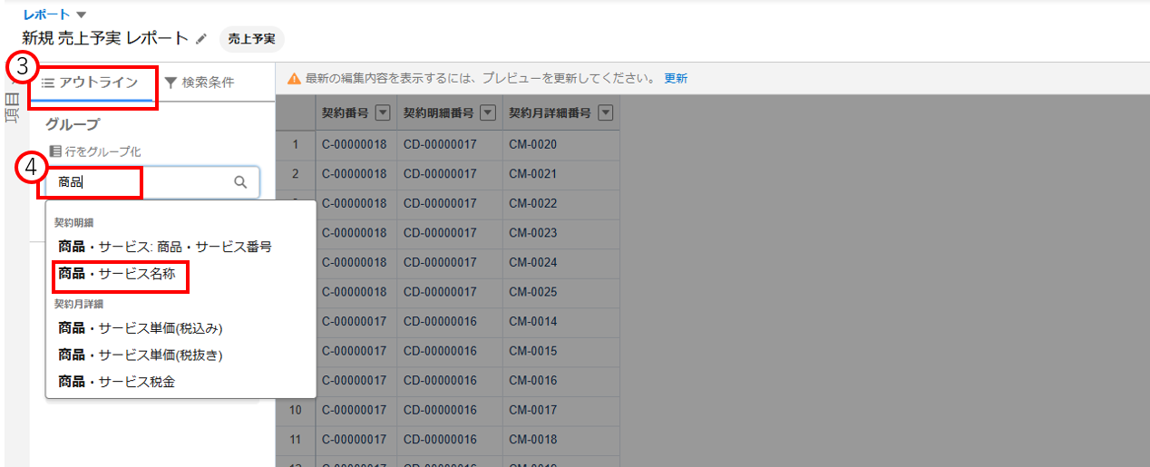 ④:[グループ]の検索タブに[商品]と入力し、[商品・サービス名称]を選択。