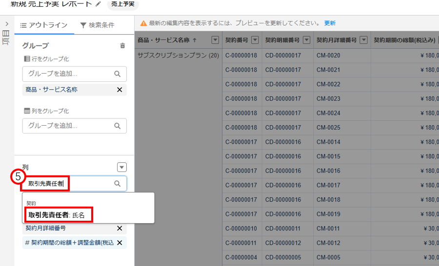⑤:[列]の検索タブに[取引先責任者]と入力し、[取引先責任者:氏名]を選択。