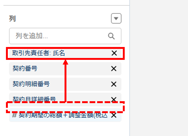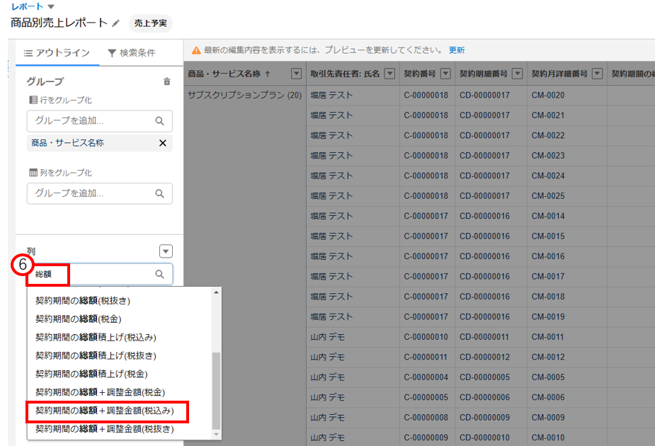⑥:[列]の検索タブに[総額]と入力し、[契約期間の総額+調整金額(税込み)]を選択。