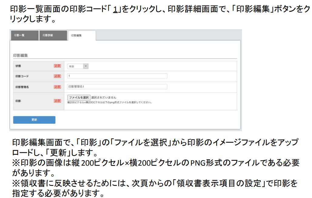 初期設定後の印影登録について【サブスクペイインボイス】 2025年03月24日 07:59 初期設定時に印影の用意が出来なかった場合、後から登録を行う事も可能です。 ただし、印影登録を行っていない状態で決済した領収書については、その後も印影は反映されませんのでご注意ください。 ※印影登録後の決済から反映されます 【設定手順】 ① ② ③ ④印影を選択し、更新