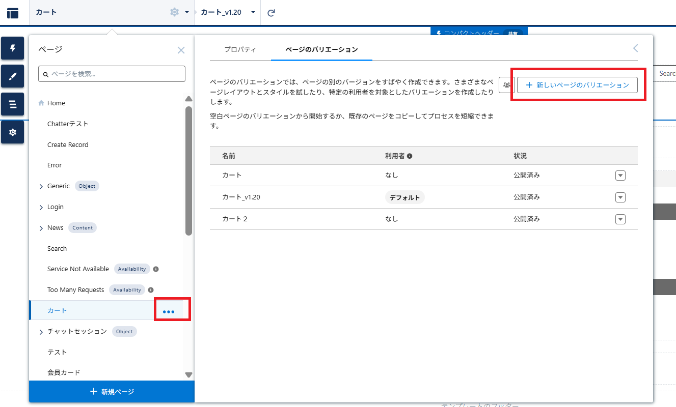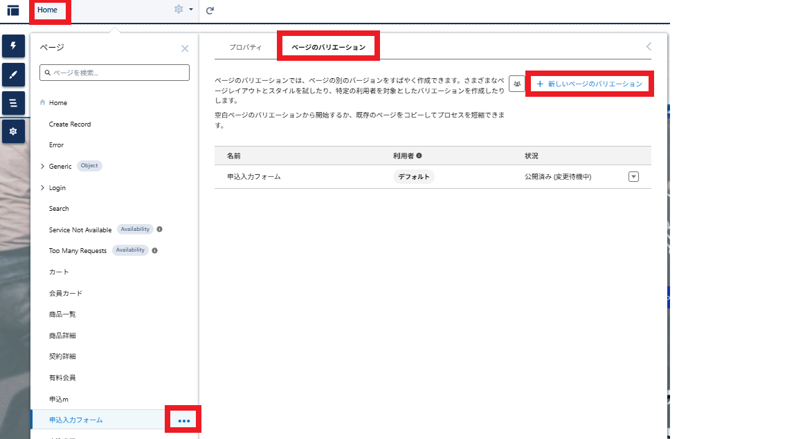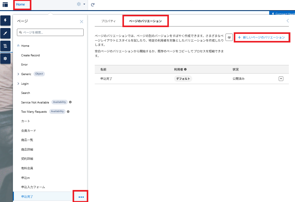 ①Home>申込完了「・・・」>ページの設定>ページのバリュエーション>+新しいページのバリエーション