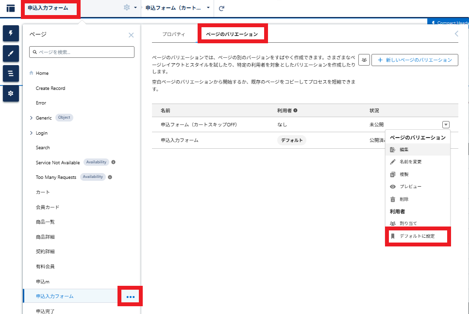申込入力フォーム>「・・・」>ページのバリエーション>「▼」ボタンをクリック>デフォルトに設定