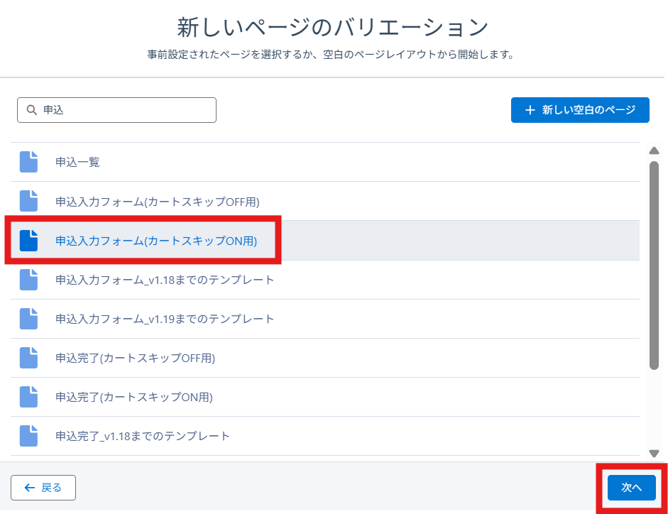 ・申込フォームを非表示にし、カート画面のみ表示したい場合 → 「申込フォーム(カートスキップOFF用)」を選択
