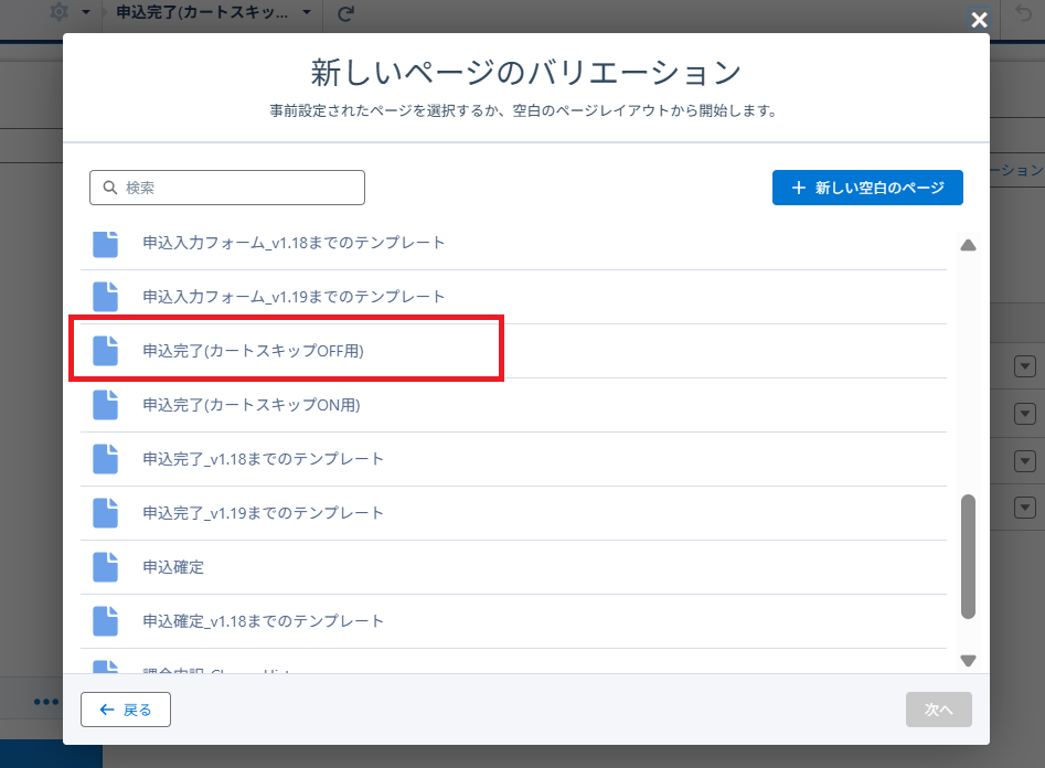 ①「申込完了」ページのバリエーションをカートスキップOFF用に設定します。