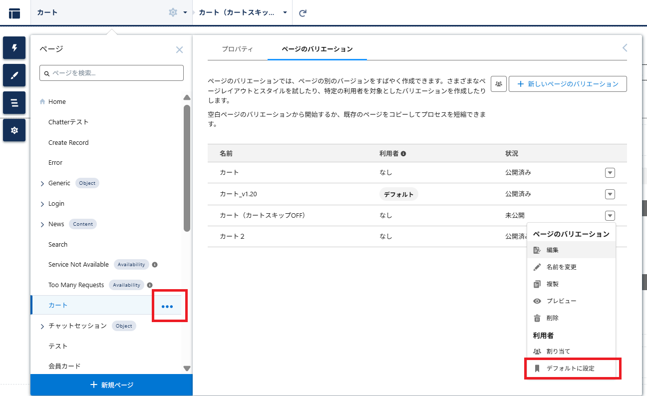 カート>「・・・」>ページのバリエーション>「▼」ボタンをクリック>デフォルトに設定