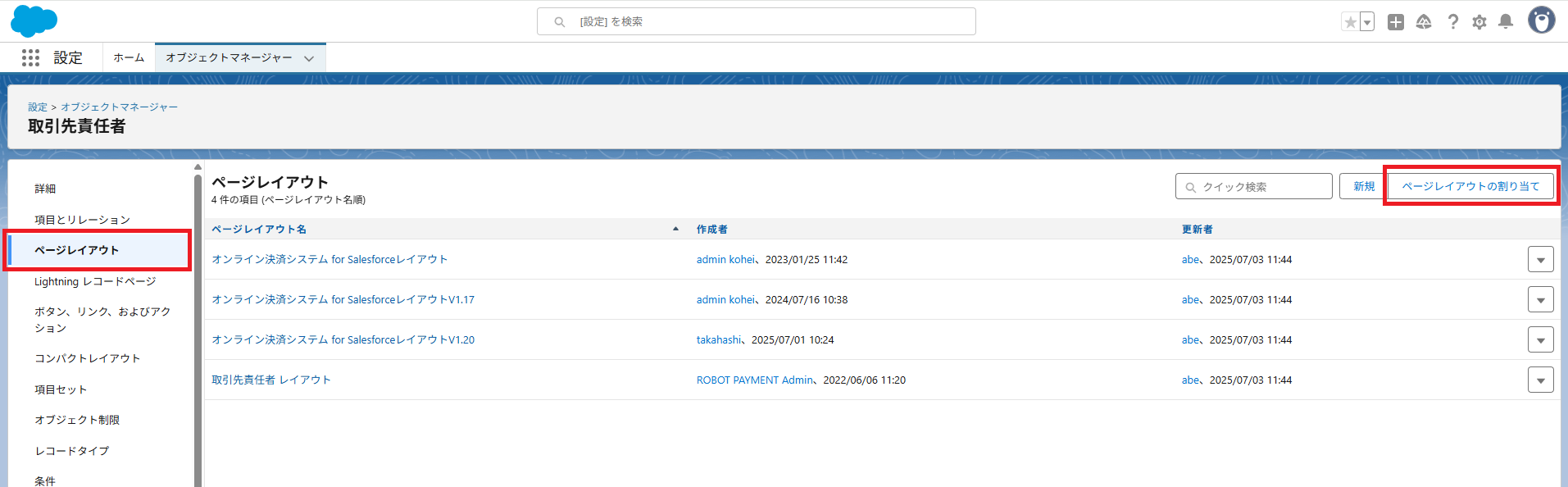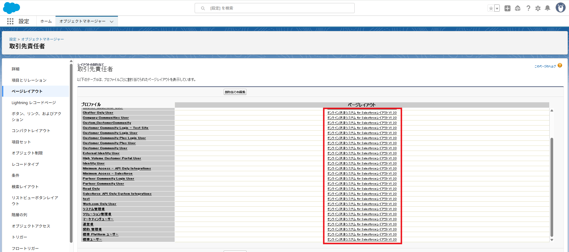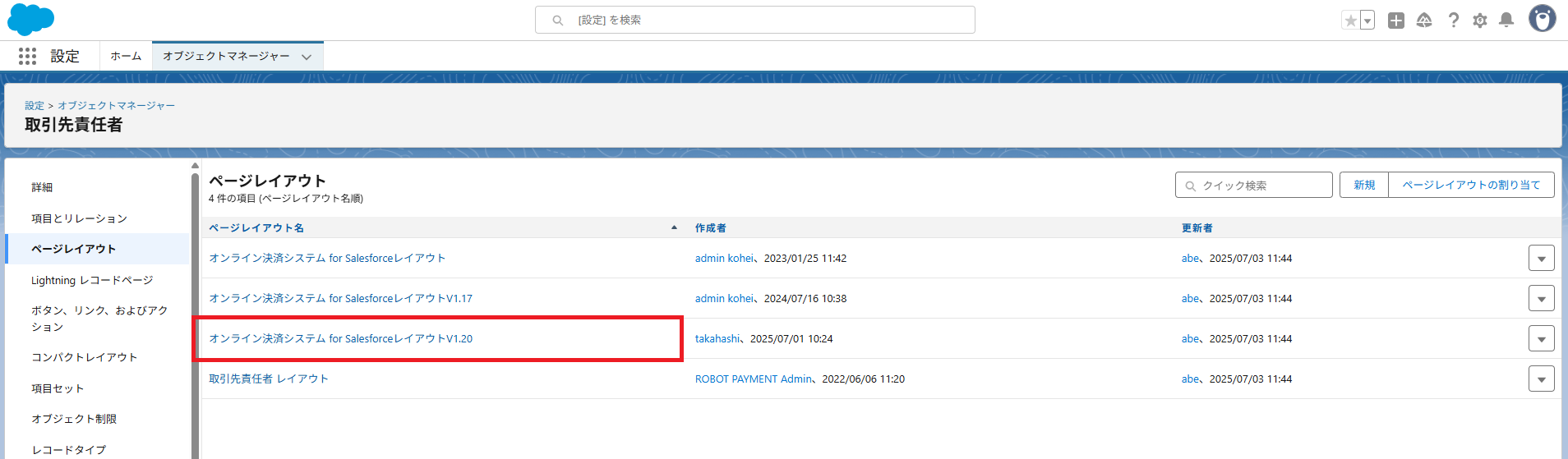 - 確認後、ページレイアウトに戻り、④で確認したページレイアウト名(例: 「オンライン決済システム for SalesforceレイアウトV1.20」)をクリック