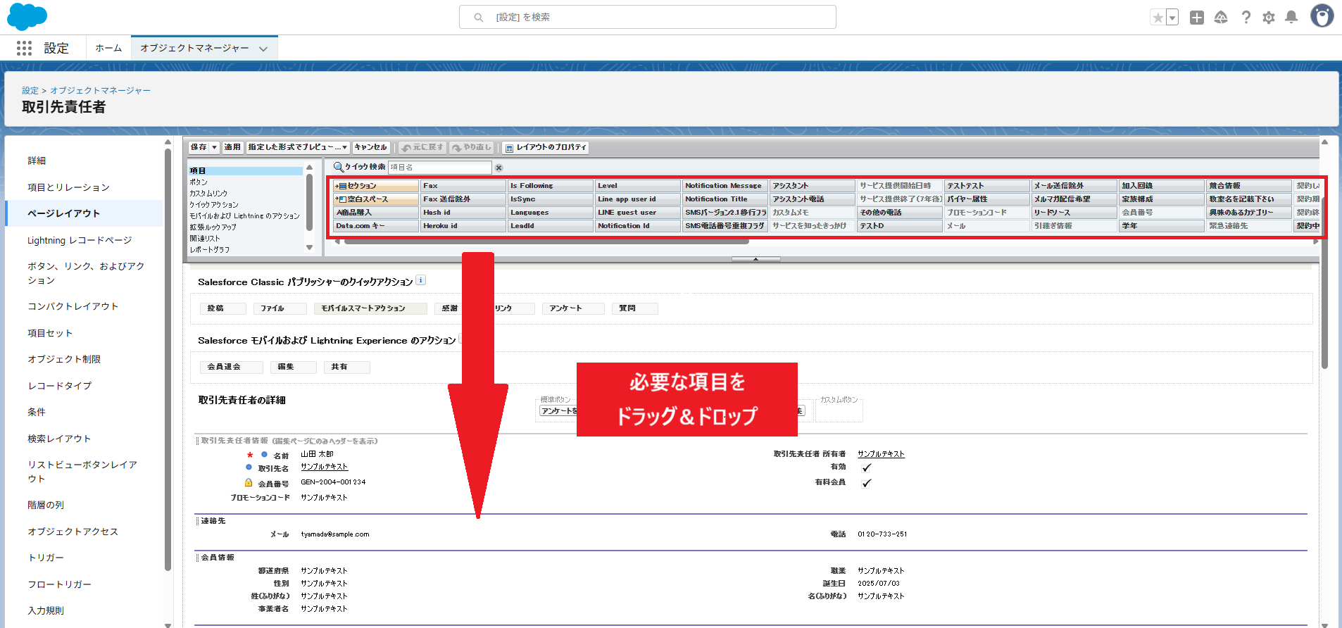 - ページレイアウト上で、表示させたい項目をドラッグ&ドロップで追加