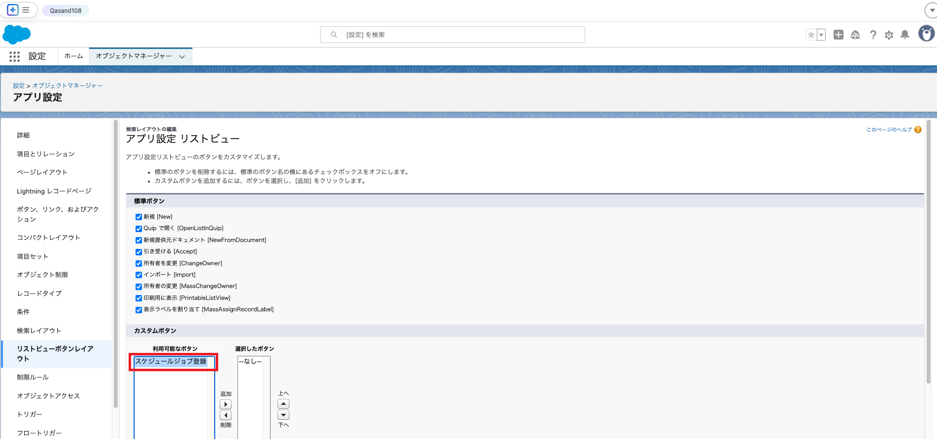 4.カスタムボタンに「スケジュールジョブ登録」を追加して保存。