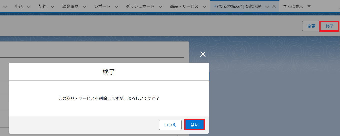 ※会員様が1つの申込の中で複数の商品を選択し、一部の商品だけを終了したい場合は、「終了」ボタンを使用してください。誤って「削除」アクションを実行すると決済データが更新されず、自動課金の金額に反映されないため、必ず「終了」ボタンを選んでください。