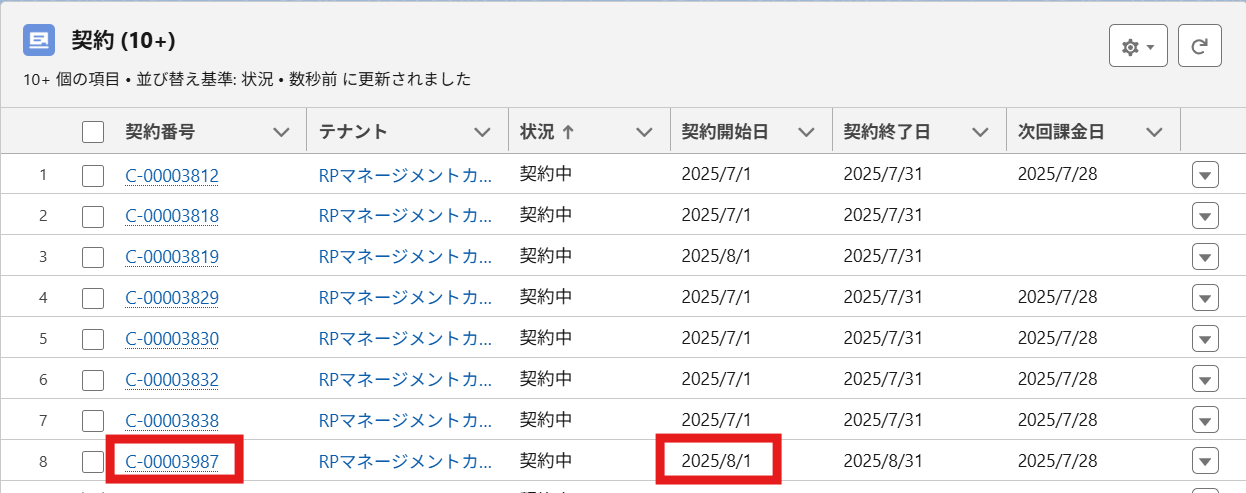 例)操作日が「7月」の場合は、「契約開始日が8月」の契約を選択します。