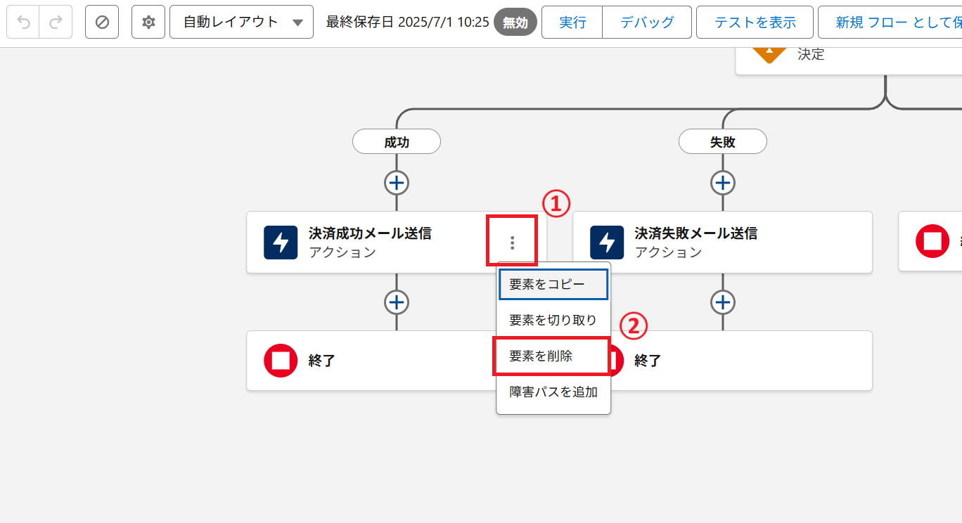 ① 上記「2. 送信元メールアドレスを設定する」の手順と同様に、該当のアクション(要素)を探し、クリックします。