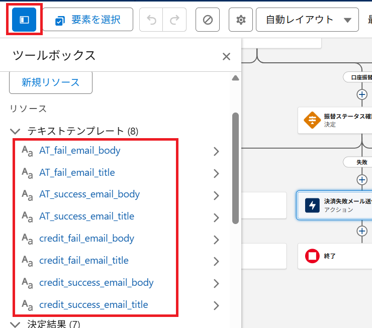 ① フローの詳細設定画面の左上にある「ツールボックス」ボタンをクリックして、ツールボックスを開きます。