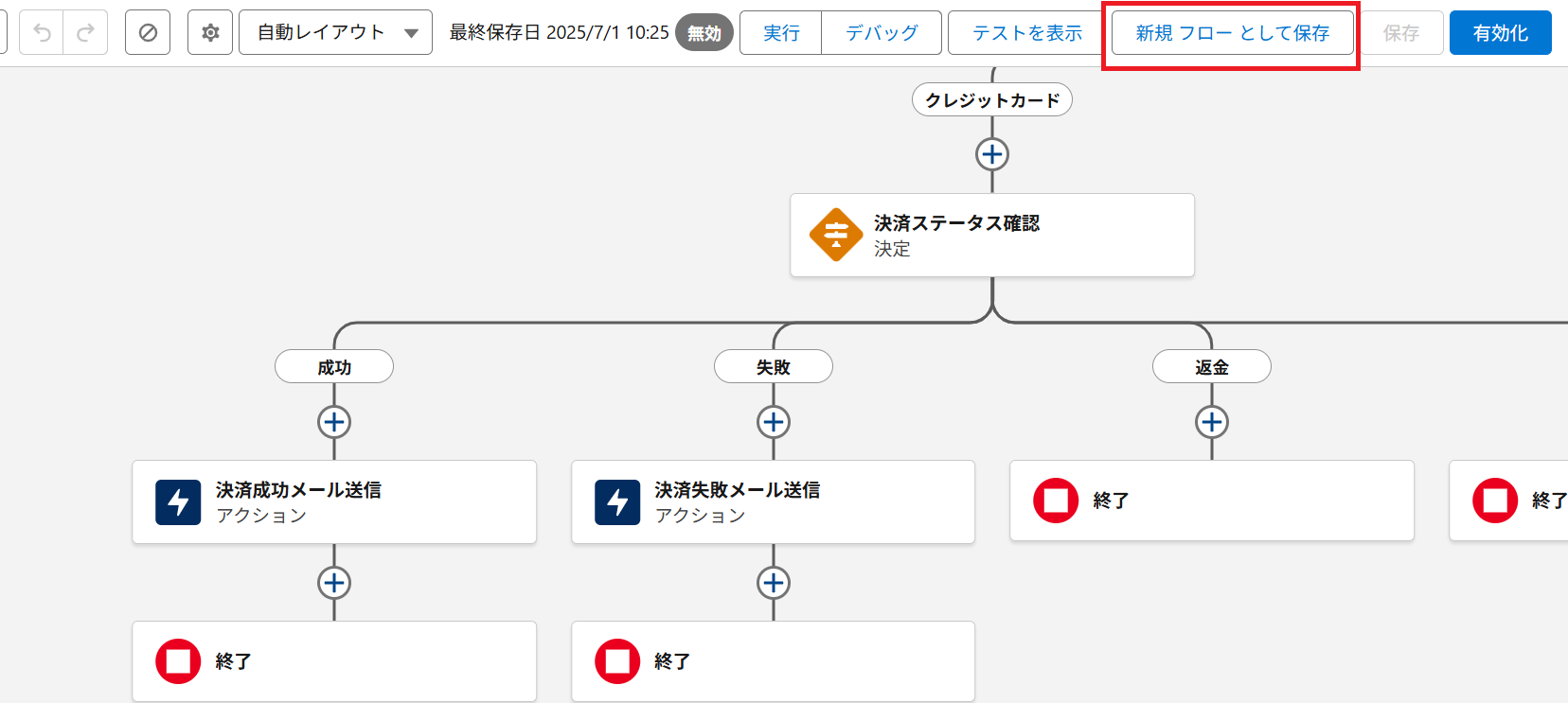 ① フローの詳細設定画面の右上にある「新規フローとして保存」ボタンをクリックします。