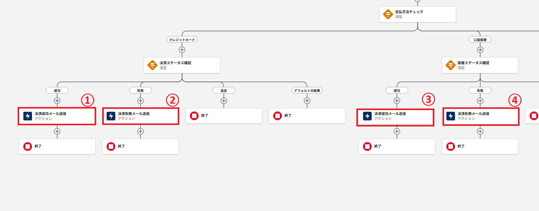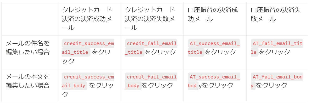 | ①決済成功メール送信 | クレジットカード決済の決済が成功した際にメール通知を行う設定 |