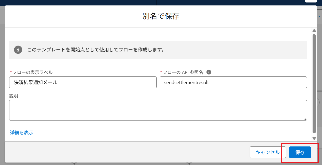 ② 保存内容を確認する画面が表示されるので、「フローの表示ラベル」「フローのAPI参照名」を記入し「保存」ボタンをクリックします。