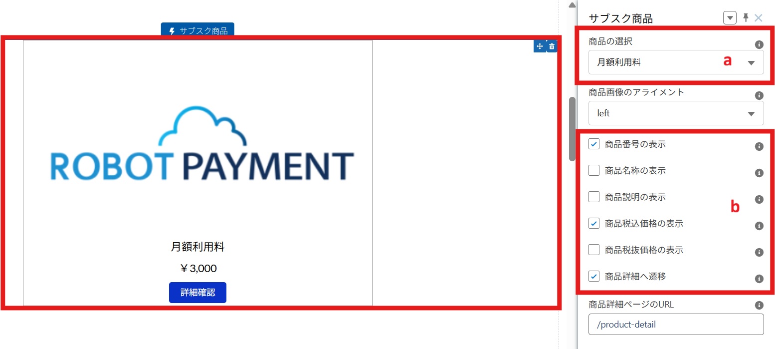 ③配置した「サブスク商品」をクリックすると、画面左側に設定メニューが表示されます。