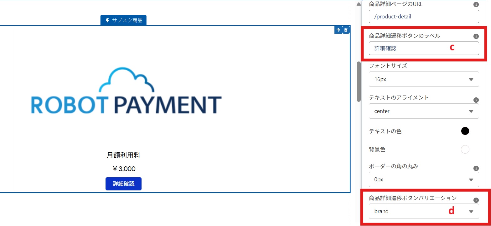 「商品詳細遷移ボタンのラベル」の入力欄で、cで設定した申込ページへ移動するボタンの名称を自由に変更できます。