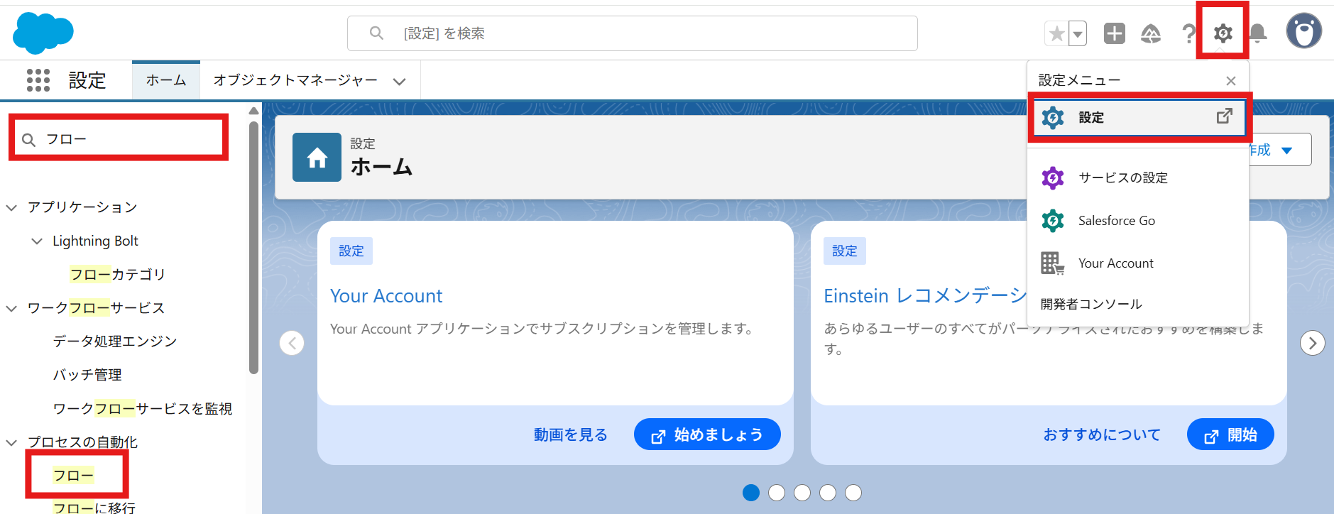 画面左側にある検索ボックスに「フロー」と入力し、表示されたメニューから「フロー」をクリックします。