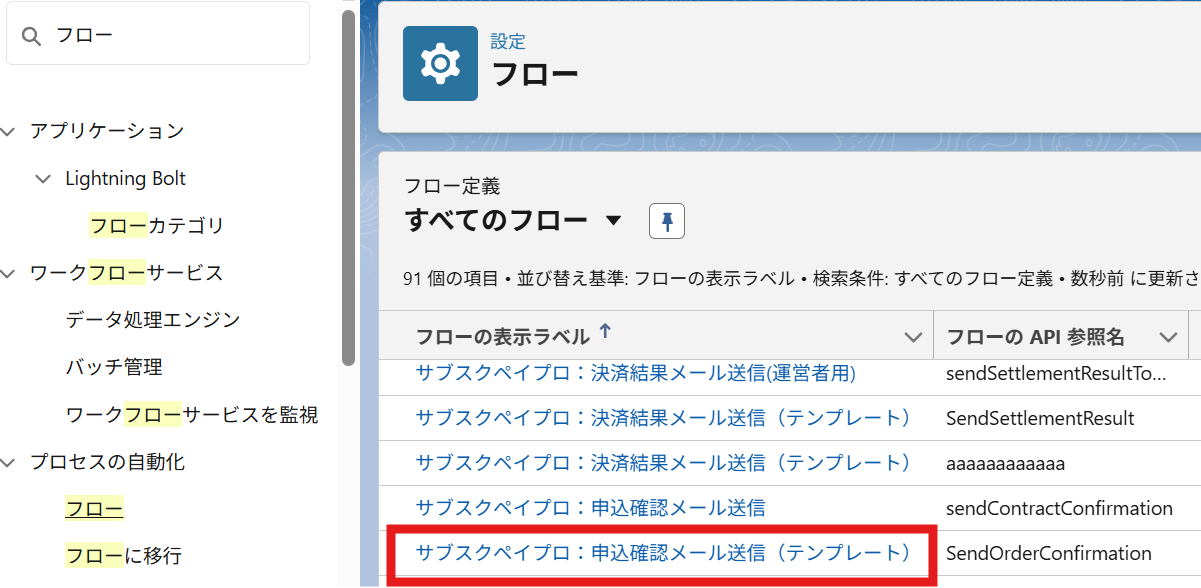 ② フローの一覧が表示されますので、「サブスクペイプロ:申込確認メール送信(テンプレート)」をクリックして開きます。