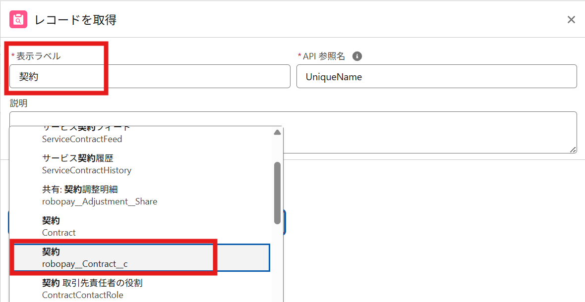 オブジェクト: 「契約(Contract__c)」を選択します。
