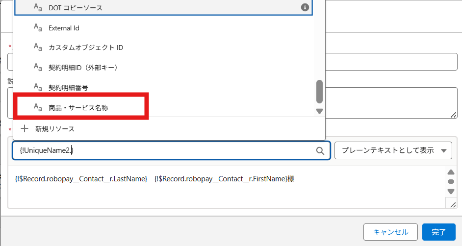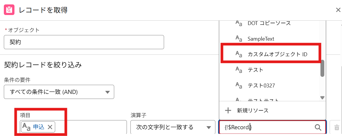 値: 「契約 契約」をクリックし、「カスタムオブジェクトID」を選択します。