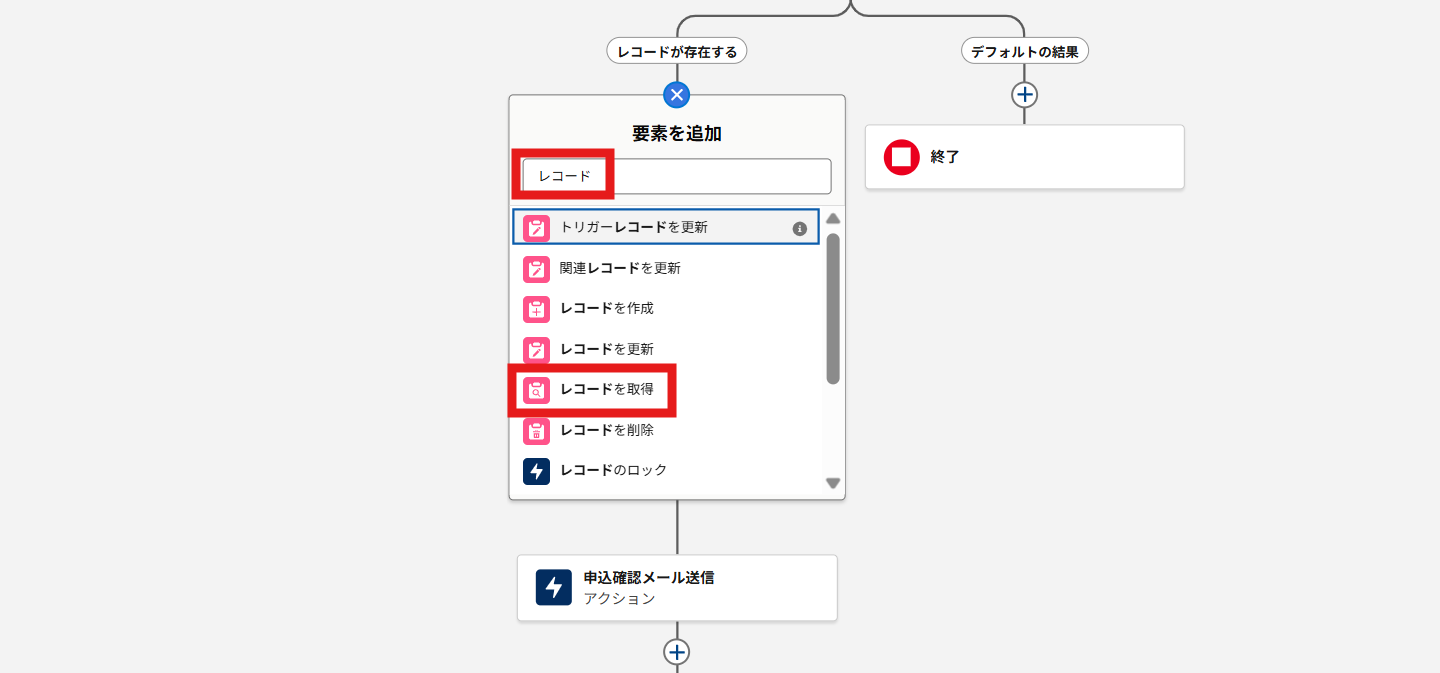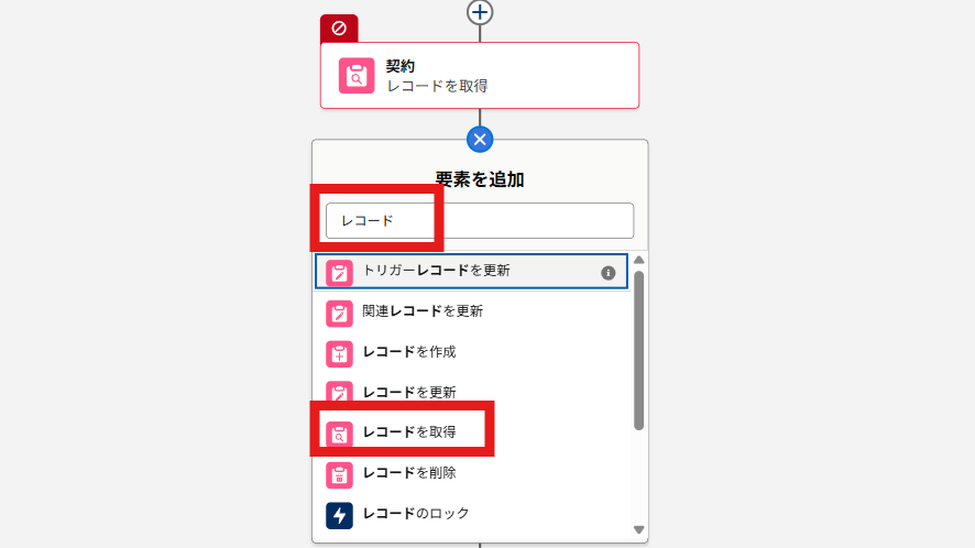 ④「レコード」と検索し、「レコードを取得」を選択します。