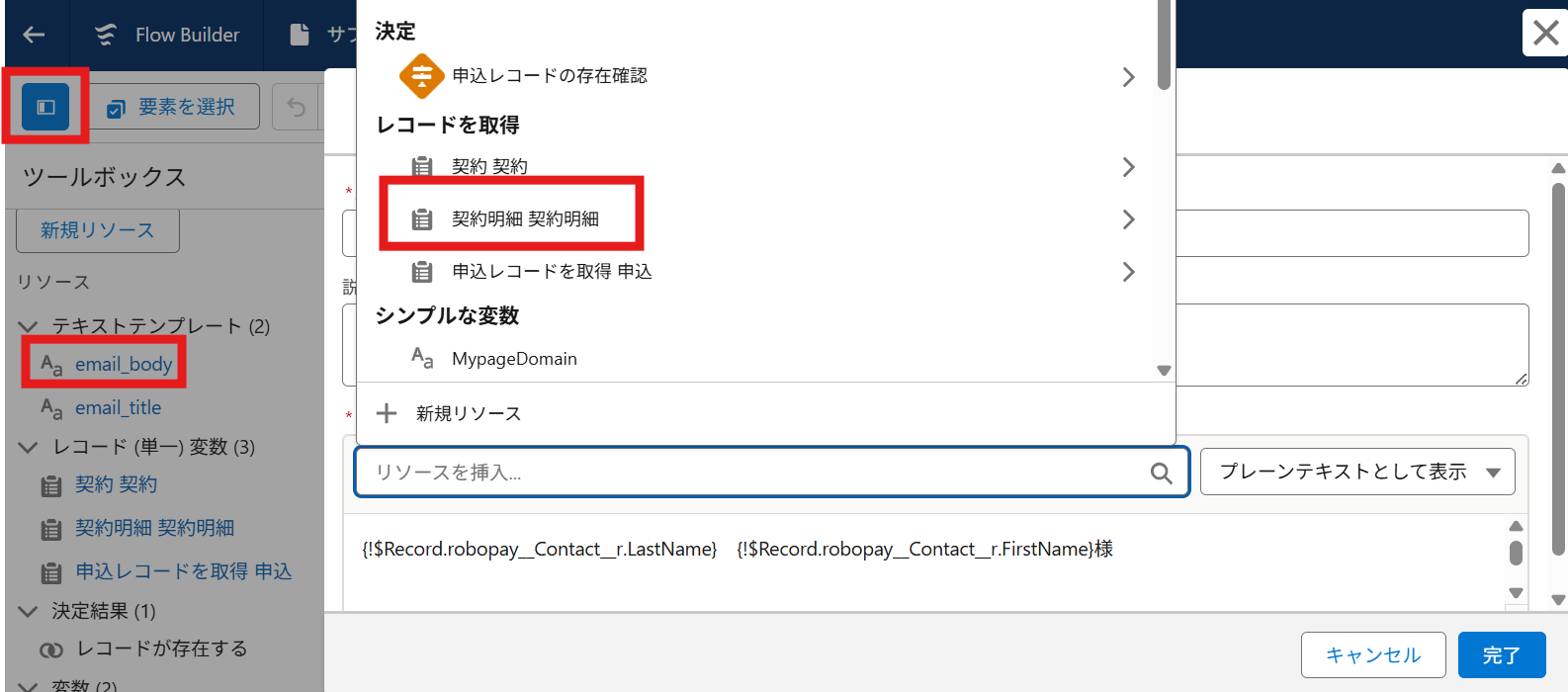 続いて「リソースを挿入」をクリックし、「契約明細 契約明細」を選択します。