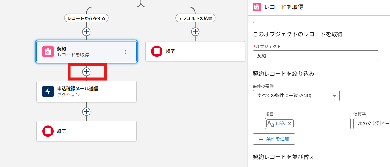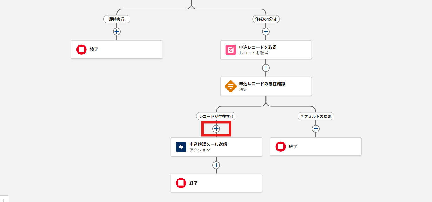 ③ フローの編集画面にて、「申込確認メール送信」の要素の上にある「+」マークをクリックします。