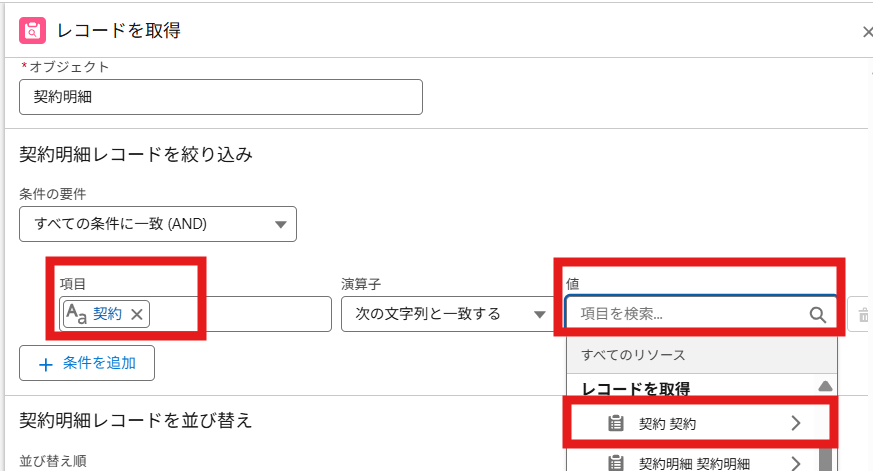 ⑥ 「契約のレコードを絞り込み」の項目で、以下条件を設定します。